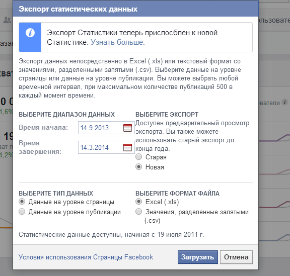 В выборе экспорта укажите «Новая», и по отдельности загрузите данные на уровне страницы и данные на уровне публикации.