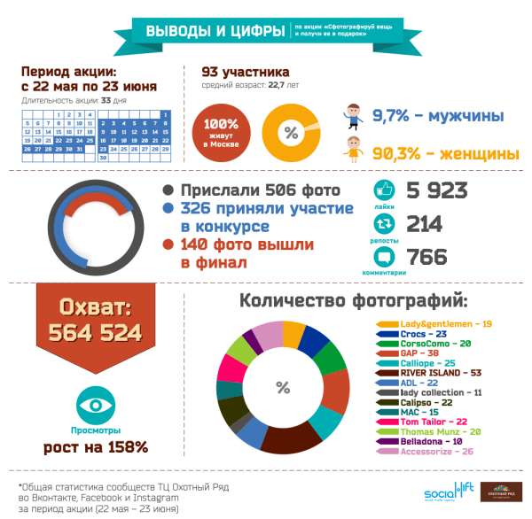 В течение 30 дней участники могли прийти в ТЦ «Охотный Ряд» и сфотографировать понравившиеся вещи в магазинах партнеров акции. Каждые три часа проводился мониторинг информации по конкурсному хэштегу, а фотографии дублировались в альбомы сообществ. Кроме посева в релевантные паблики, информация об акции размещалась в официальных сообществах брендов-партнеров и транслировалась по внутреннему радио ТЦ.