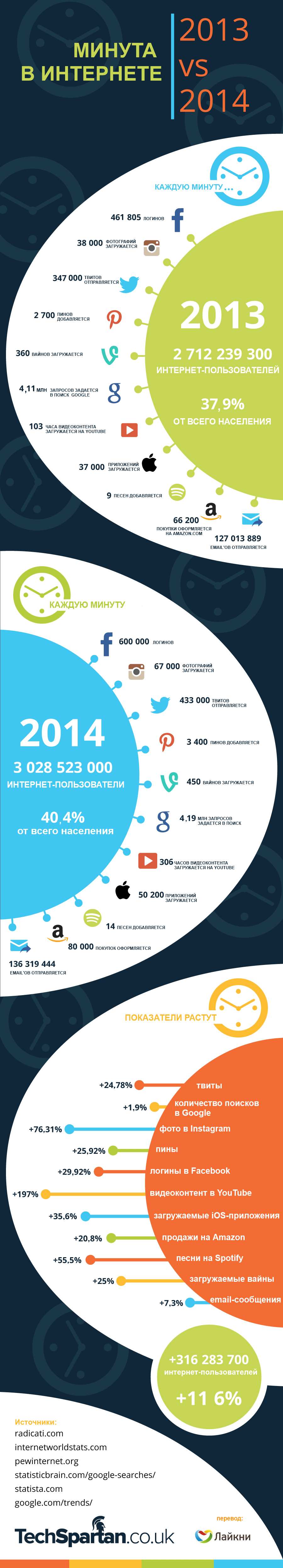 С каждым годом все больше людей проводят время в онлайне и, соответственно, увеличивается количество контента, загружаемого в интернет. Наглядно проследить этот процесс нам предлагает инфографика от TechSpartan: