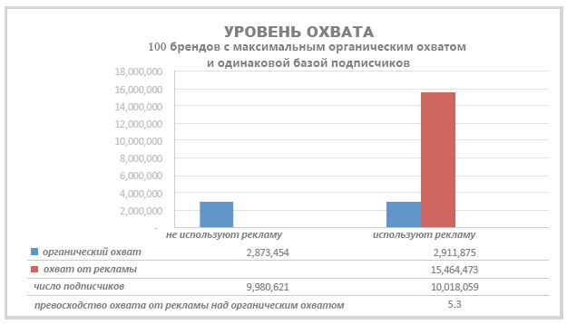 Итак, исследователи изучили 100 крупнейших брендов на Facebook, 50 из которых давали рекламу, а оставшаяся часть нет. При примерно одинаковом количестве подписчиков страниц бренды, которые активно используют рекламу, охватывают в 5,3 раза больше пользователей, чем компании, не использующие рекламу.