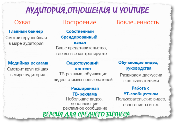 В зависимости от размера вашей компании, YouTube-стратегия может отличаться. Предположим, что вы компаний среднего размера. В этом случае, на стадии «Охват» YouTube будет использоваться как обычная рекламная платформа.