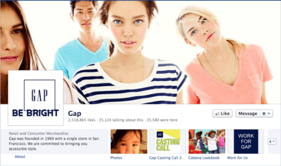Замыкает десятку лучших брендированных страниц сообщество компании Gap. Оно имеет одну из самых ярких обложек, а timeline наполнен весьма привлекательными изображениями богатого ассортимента магазина.