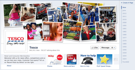 На первый взгляд, коллекция фотографий на обложке бренда, представляющего онлайн-магазин, немного беспорядочного содержания. Однако Tesco проделал хорошую работу по заполнению своего timeline, ежедневно выкладывая разнообразный визуальный контент. Как и следовало ожидать, большинство постов бренда посвящены рекламе новых предложений и скидок.