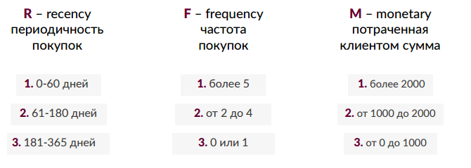 Хорошая методика сегментации клиентов на основе анализа их покупательской активности. За основу берется три параметра: периодичность покупок, их количество и сумма потраченных клиентом средств. Их внутренняя градация индивидуальна и зависят от вашего бизнеса: жизненного цикла продаваемых вами товаров и их стоимости. Но при составлении грейдов есть один общий принцип: первым пунктом идет наилучший для вашего бизнеса показатель, когда клиент становится выгодным для вас. Однако не завышайте планку, чтобы не выходить за рамки реалистичных расчетов.