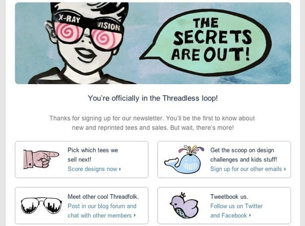 Например, Threadless в теме письма пишет обращение pal (приятель), что тут же привлекает внимание пользователя.