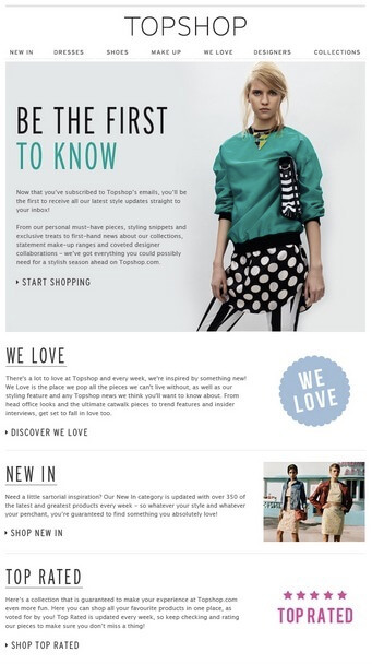 Однако чем больше контента будет в письме, тем явнее его проигнорируют пользователи. Большинство брендов в качестве приветственного письма присылают нечто простое, с минимумом текста и картинок. Однако в письме, к примеру, Topshop, есть четыре разные секции, которые призывают перейти на сайт и совершить покупки – и не каждому пользователю будет интересно читать этот огромный текст.