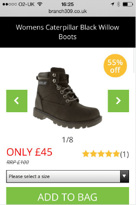 Посмотрите на мобильный сайт Schuh. Они решили, что детали товара так же важны, как и call to action. Поэтому была установлена автоматическая прокрутка страницы в обход навигации.