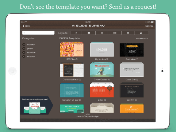 Slide Bureau – приложение, которое будет интересно пользователям iPad. На основе готовых шаблонов, разбитых по категориям, вы можете быстро создать кастомизированую презентацию. Приложение абсолютно бесплатное. Скачать можно в iTunes.