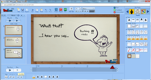 GoAnimate – еще один интересный сервис, позволяющий создавать анимированные презентации и обучающие ролики. У вас нет опыта в создании мультипликации? Не беда! Сервис довольно прост и рассчитан специально для новичков. Пользователям доступны шаблоны анимированных фонов, библиотека шумовых эффектов, фильтры. Кроме того вы сами можете настраивать и управлять движениями и эмоциями персонажей создаваемого ролика. Вы даже можете давать голоса своим героям, используя свои файлы или синтезированные компьютером голоса. Для знакомства с сервисом есть бесплатный тарифный план.