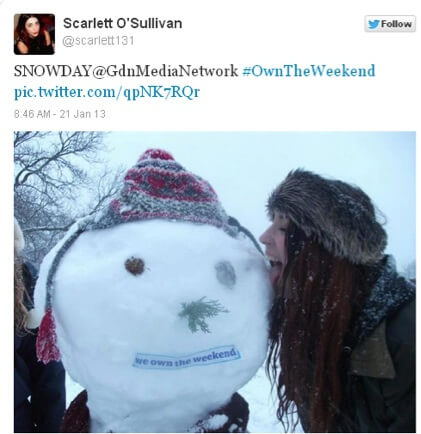 Британская газета «The Guardian», (с посещаемостью 4 млн. уникальный посетителей в день), решила вовлечь пользователей призывом поучаствовать в проекте «Own the Weekend» (Хозяин выходных). Редакция предложила читателям сделать «что-то крутое» на выходных и затвитить фотографию действия с хэштегом #owntheweekend, получив шанс выиграть iPad Mini. Разумеется, сотни пользователей с большим энтузиазмом приняли участие в конкурсе.