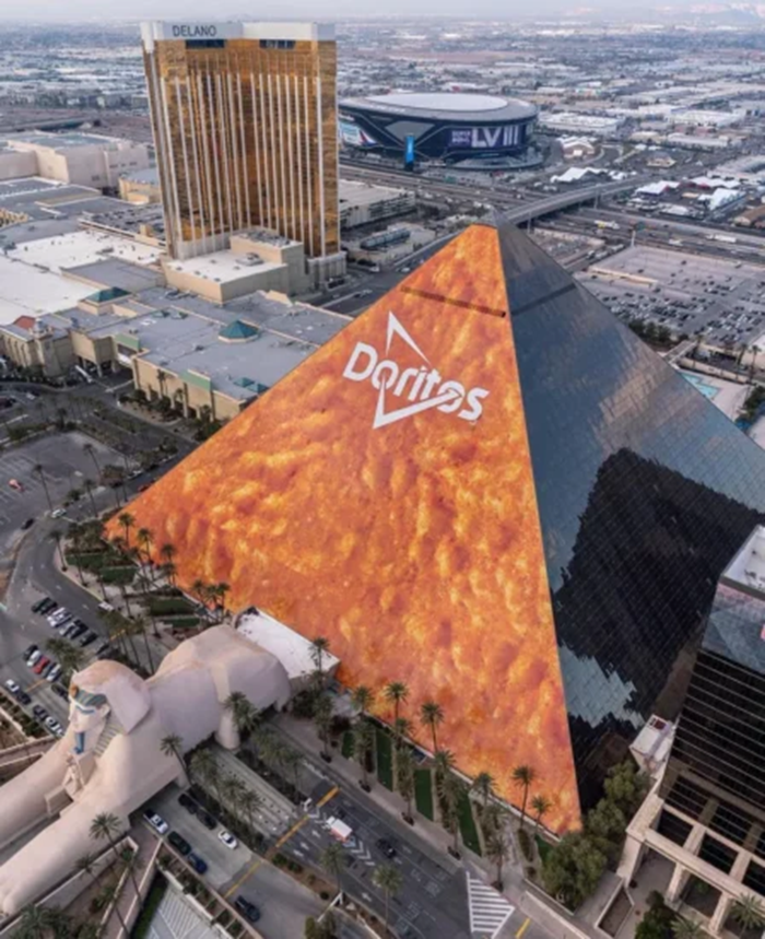 Отель Luxor, который был медиацентром Супербоула в Лас-Вегасе, превратили в гигантский треугольный чипс Doritos.