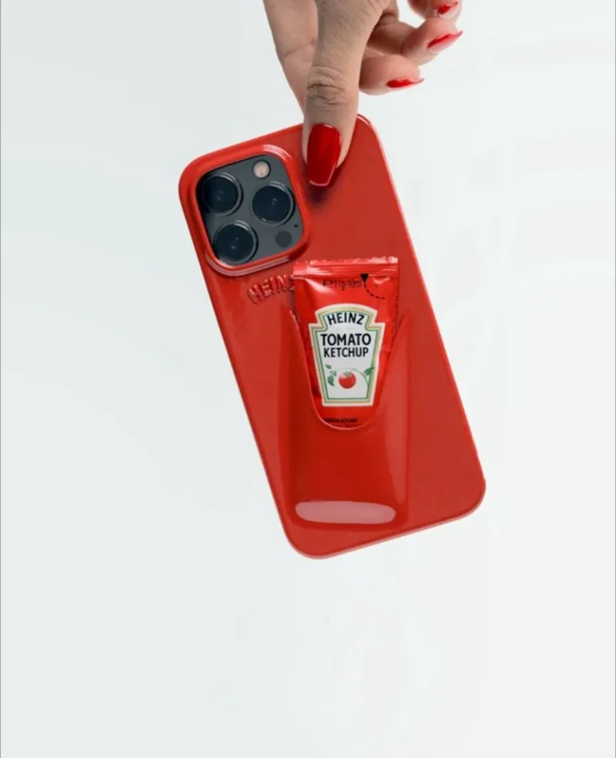 Переосмысляя вирусный чехол для телефона с блеском для губ Rhode от Хейли Бибер, Heinz прорекламировал собственный чехол, идеально подходящий для одного пакетика томатного кетчупа.