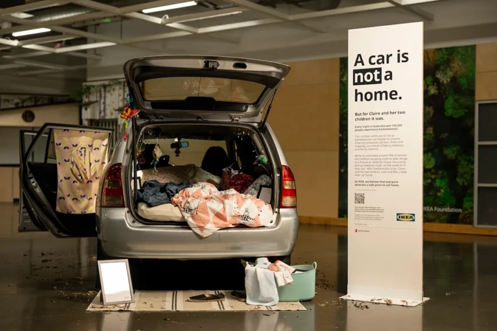В 2024 году IKEA совместно с Save the Children освещала тяжелое положение более 120 000 женщин и детей, которые остались без крова из-за домашнего насилия. Компания стремилась передать идею о том, что жертвы вынуждены искать убежище в местах, которые никто не назовет домом, и ночевать в машине, в палатке, на диване друга.