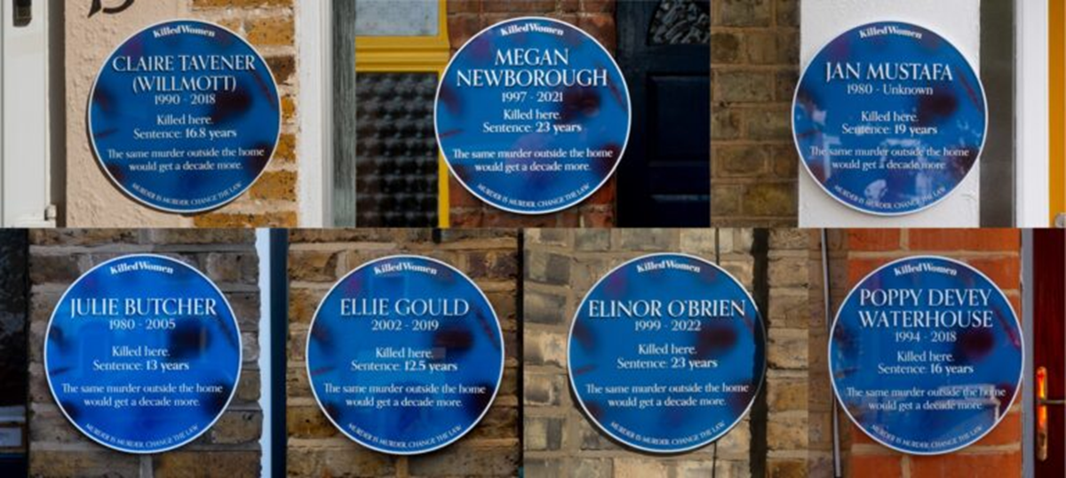 Черно-синие таблички были прикреплены к домам и квартирам убитых женщин в рамках кампании Killed Women (и агентства Earnies) по выявлению «устаревших и женоненавистнических» законов Великобритании о вынесении приговоров за убийства. На каждой табличке жертвы было указано «убит здесь», а также приговор, вынесенный убийце, и лозунг «Убийство есть убийство, измените закон».