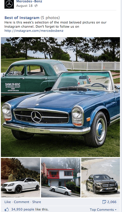 5. Настройте автоматическую интеграцию фотографий из Instagram в Facebook, это увеличит количество репостов. Такие компании, как Mercedes Benz набирают много лайков при помощи кросс-постов: