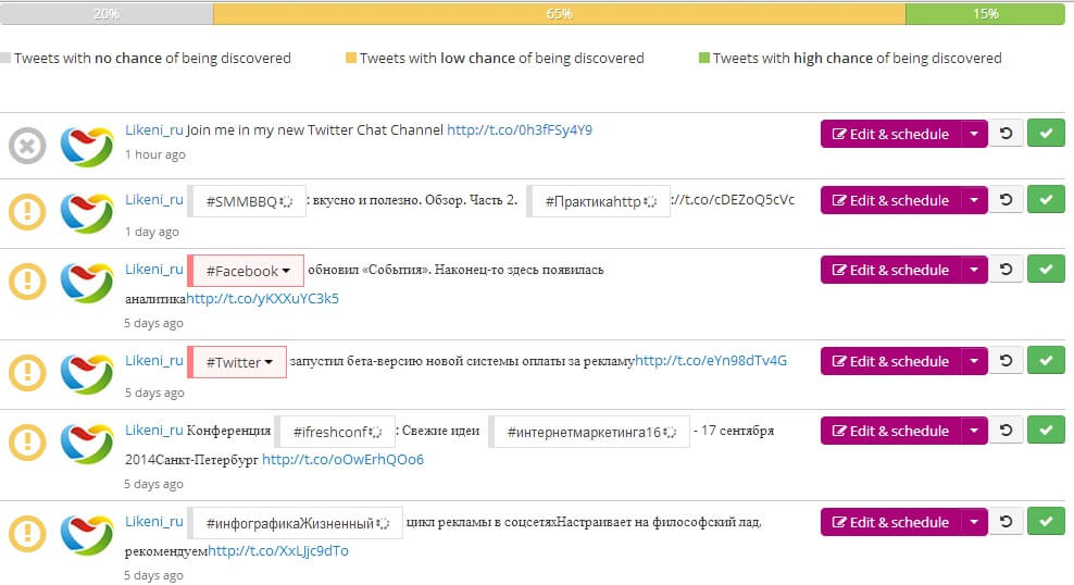 Сервис анализирует время активности ваших фолловеров, на основе чего предлагает время для публикации ваших постов. Будущие твиты остается только добавить в сервис, после чего приложение заархивирует их и равномерно опубликует в определенное время. Имеются сокращатель ссылок и возможность подключения аккаунтов коллег для работы в сервисе.