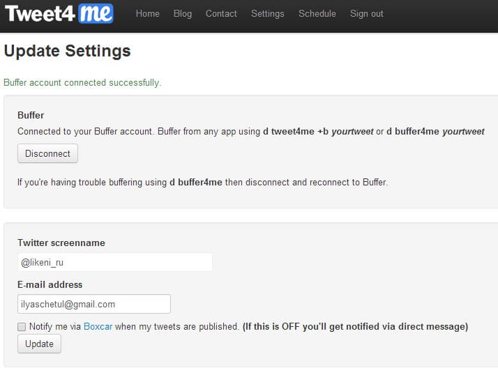С помощью этого приложения можно отправить персональное сообщение аккаунту в Tweet4me, использовать стенографии и префиксы, необходимые для обозначения времени публикации, а также публиковать твиты.
