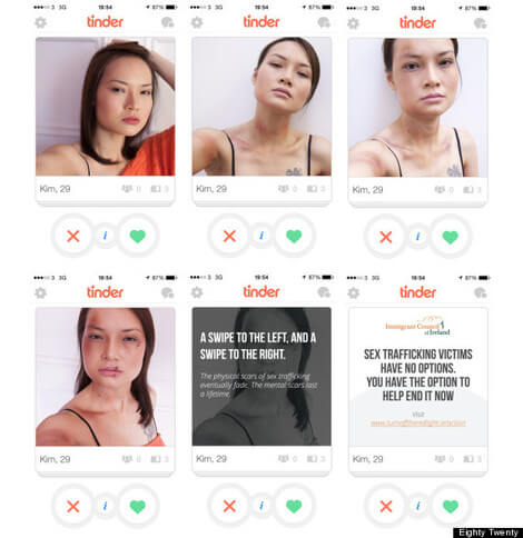 Ирландский совет по вопросам иммиграции привлек внимание к проблеме секс-торговли при помощи , приложения для поиска пары по заданным параметрам. В созданном профиле размещали обычные фото девушки. Затем они заменялись изображениями, на которых были видны следы физического насилия.