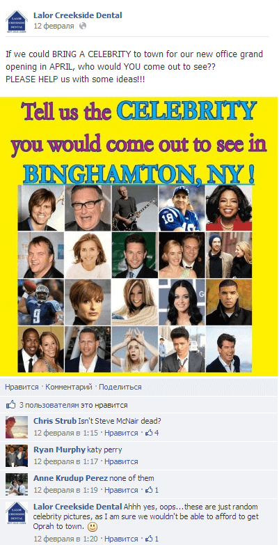 Спросить у своих пользователей, кого из знаменитостей они хотели бы видеть на открытии нового офиса компании, было неплохой мыслью. Но вот сопроводить пост картинкой с фото, на котором изображен спортсмен, погибший несколько лет назад, как-то странно. Не спасли и объяснения в комментариях, что картинки подобраны в случайном порядке, - наоборот, все стало выглядеть еще более жалко. Впрочем, как и попытки оправдаться, что присутствие Опры тоже не планируется, и она, как и все остальные, случайно «засветилась» на изображении.