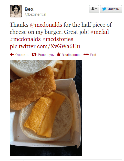 В попытке пробудить в пользователях Twitter теплые воспоминания, связанные с Happy Meal и McFlurry, бренд запустил хэштег #McDstories. Однако вместо веселых и радостных историй о замечательном фаст-фуде пользователи начали постить твиты о сомнительном качестве еды, неприятных последствиях приема такой пищи и т.д. Самое ужасное – это нельзя было остановить.