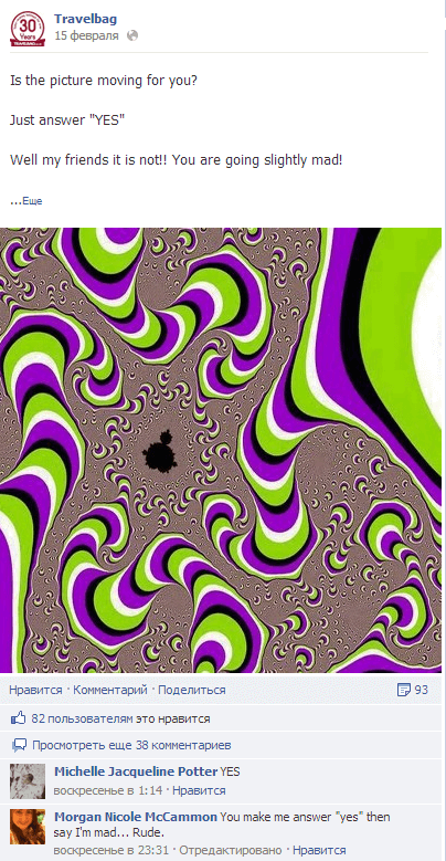 Не самая лучшая идея опубликовать оптическую иллюзию, заявить своим пользователям, что, если они видят движение, они «слегка того», а потом еще и попросить поделиться этой прекрасной новостью. Некоторые могут счесть это грубостью.