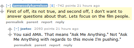 Вместо того чтобы честно и искренне отвечать на вопросы пользователей, Вуди вспоминал свою работу над фильмом «Бастион» (причем в большинстве случаев это было абсолютно не к месту). Пользователи быстро поняли, что это лишь плохо спланированная PR-акция, и поспешили выразить свое возмущение.