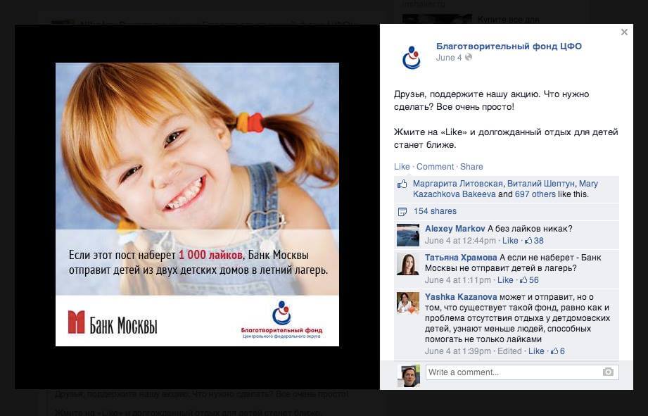 Благотворительный фонд ЦФО «Поддержка детей и семей в трудной жизненной ситуации» объявил, что его партнер Банк Москвы – отправит детей из двух детдомов в летний лагерь, если соответствующая запись в Facebook соберет тысячу «лайков». Поступок, который может показаться на первый взгляд благородным, вызвал бурю негодования:
