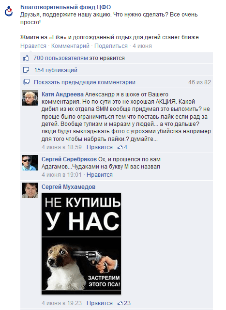 Смелое и нетривиальное решение благотворительного фонда. Можно было бы показывать этот кейс как бенчмарк на конференциях, если бы не одно но: репутационные риски. "Специалисты" из фонда подставили своего клиента. Для того чтобы понять всю сложность ситуации, достаточно ознакомиться с шерами поста, которые пестрят сообщениями вроде "фу", "Это просто ужас!!!! Просто нет слов.... Высший пилотаж цинизма...", "Пример наглядной социальной антирекламы, совет директору банка - поувольнять маркетологов без компенсации, а на освободившиеся зарплаты отправить 10 детей из детдома в летний лагерь". После подобных выходок понимаешь, почему клиенты утверждают с "партнерами" каждую букву и следят чтобы правила игры были соблюдены. В противном случае страдает имидж компании, а если ее акции можно приобрести на бирже, тогда последствия могут быть катастрофическими.