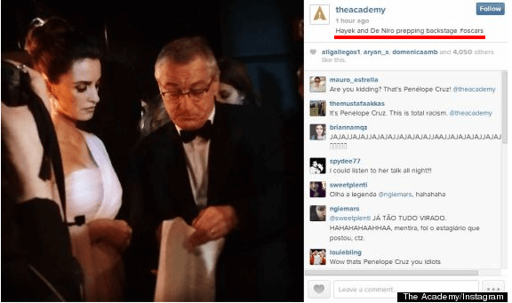 Аккаунт в Instagram Американской киноакадемии порадовал подписчиков во время вручения Оскара. Возможно, это не бросается в глаза, но фото озаглавлено как «Хайек и Де Ниро готовятся за кулисами». Спутать Пенелопу Крус с «другой испанкой» Сельмой Хайек – что это, случайность, непреднамеренный расизм?