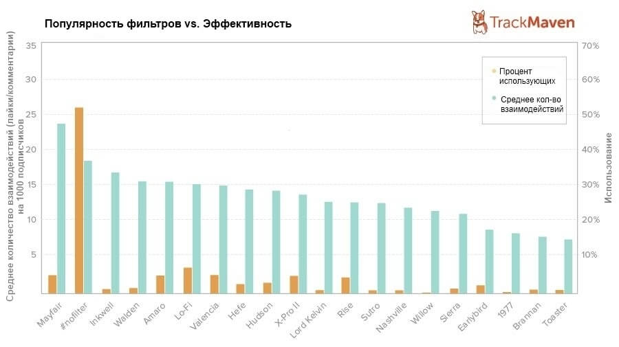 На диаграмме видно, что фильтр Mayfair стимулирует в среднем 23,044 взаимодействий (сумма лайков и комментариев), Normal — около 18,009 и Ikwell— 16,407.