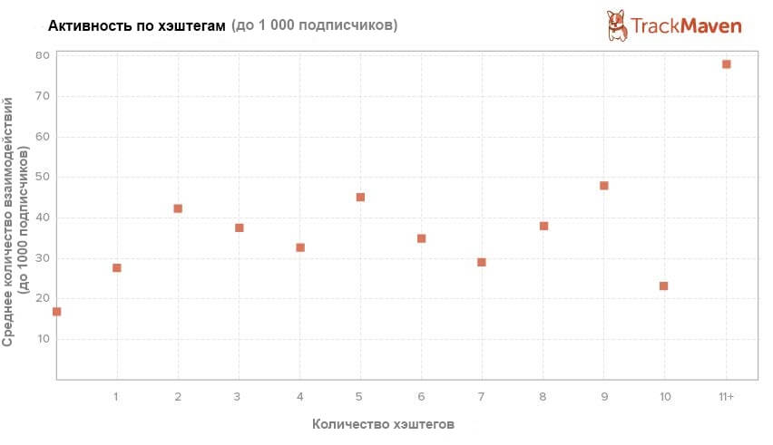 Бренды с более 1 000 подписчиками в среднем получают 21,21 взаимодействия на пост. Однако поразительные цифры на страницах, у которых меньше 1000 подписчиков — их посты могут содержать до 11 хэштегов и получать в среднем 77,66 лайков и комментариев.