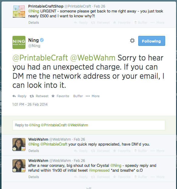 – Меня чуть удар не хватил, огромное спасибо Кристал из @Ning за быстрый ответ. Деньги вернули в течение полутора часов после твита #впечатлена *дышу*