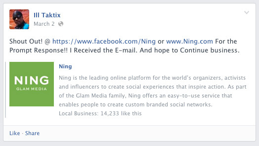Один из пользователей Ning (платформы для создания социальных сетей) был недоволен новым релизом и опубликовал пост на Facebook. Кристал, специалист по работе с клиентами, не могла ответить на него, так как сообщение было защищено настройками приватности. Тогда она «вычислила» клиента при помощи приложения по поддержке пользователей и связалась с ним по электронной почте, чтобы исправить ситуацию.