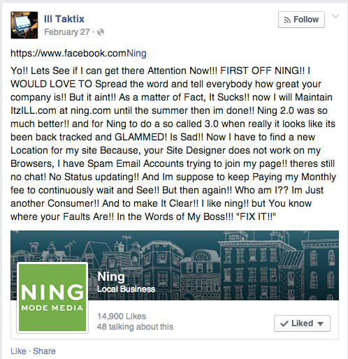 Привет! Давайте проверим, обратят ли на меня внимание теперь! Ning! Я бы с удовольствием рассказал всем, как я вас люблю и какая вы замечательная компания. Но это не так. На самом деле все ужасно!! <Перечисляет ужасы релиза…> И я должен продолжать платить абонентскую плату, чтобы постоянно сидеть и смотреть!! Но кто я такой? Обычный клиент!! Мне нравится ning!! Но вы знаете, в чем ваша вина!! Как говорит мой босс: «Исправьте это!!»
