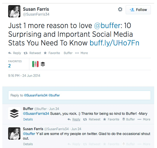 – Сьюзан, вы жжёте :) Спасибо, что так добры к Buffer! –Мэри