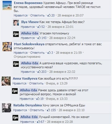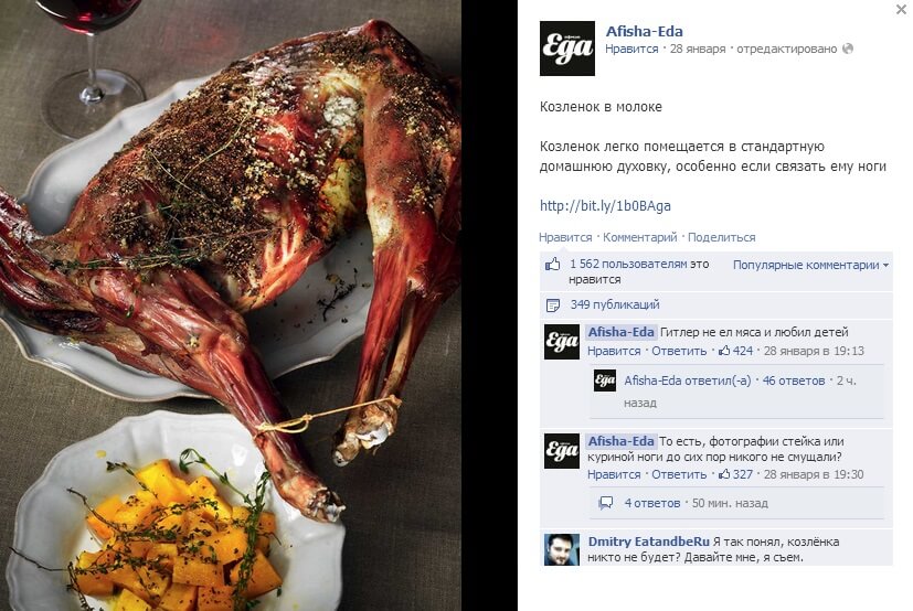 Одно дело – есть мясо, и совсем другое – видеть несчастное убитое животное со связанными ногами. Одни читатели возмущались и отписывались от сообщества, другие не увидели в фотографии ничего страшного. Сами представители «Афиши» не только не удалили пост, но и потроллили читателей в комментариях.