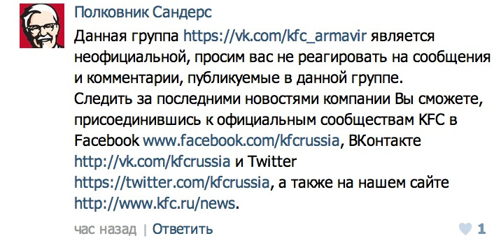 Представители KFC поступили правильно в данном случае. Они указали, что группа KFC-Армавир не является официальным представительством бренда в Интернете и попросили прощения у всех, кого мог оскорбить стиль общения в том паблике. Кроме того, было заявлено, что идет разбирательство через администрацию ВКонтакте. Вообще, это хороший урок SMM-менеджерам бренда на будущее - работа с неофициальными сообществами в Интернете не менее важна, чем ведение своих проектов. Понятно, что влиять получится не на всех, но «неадекватов» можно отследить сразу.