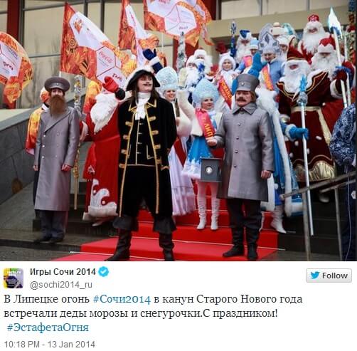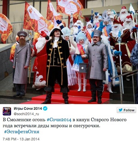 Только стихли разговоры вокруг «проблемного» армавирского офиса KFC, как в SMM-среде появилась новая тема для обсуждения. На этот раз отличились специалисты, которые вели официальный Twitter-аккаунт «Игры в Сочи 2014». Сначала они опубликовали твит с фотографией эстафеты огня в Смоленске.