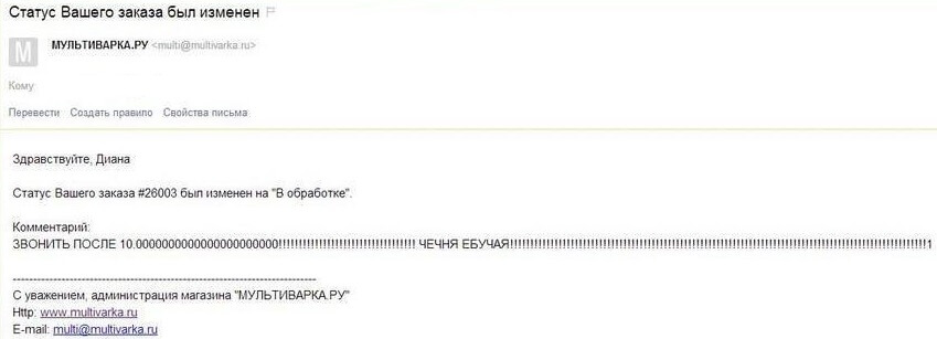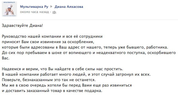 Естественно, Диана решила поделиться скриншотом письма у себя в Facebook. Представители магазина довольно быстро среагировали. Виновные были наказаны, а злополучная мультиварка подарена.