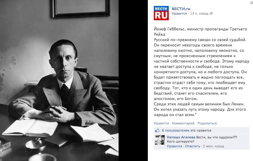 Почему последнего причислили к «великим»? Приблизительно таким вопросом задались подписчики Вестей.ру в соцсетях. А что же Вести? Пост с цитатой Геббельса удалили, SMM-редакцию уволили в полном составе.