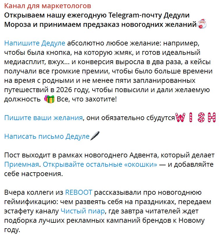 Переходя из одного канала в другой, аудитория погружалась в новогоднюю атмосферу. Участники адвента рассказывали про новогодний брендинг, репутационную гигиену, праздничные рассылки для блогеров, особенности B2B-маркетинга в 2026 году, тренды, желания, архетипы, развлечения и другие интересные темы.