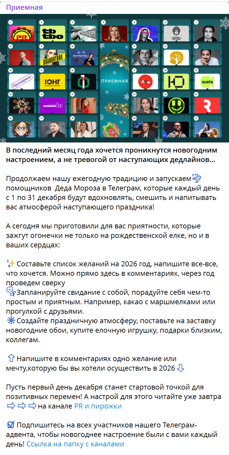 Тут вы спросите: «Почему 31, вы же пишете 32?» Из-за большого числа желающих мы придумали и запустили адвент в Приемной, канале агентства GromPR, а уже другие участники создавали и публиковали тематические посты.