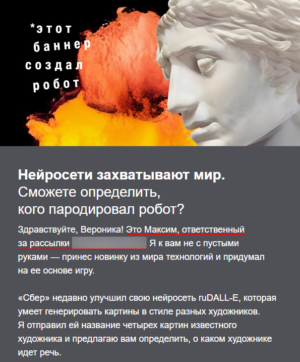 На нашем проекте мы добавили в письма персонажа Максима, ответственного за рассылки этого бренда. И того, кто подготовил эту статью.