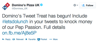 Когда вы добавляете хэштег, который будет ассоциироваться с продуктом, кампанией или событием, вы даете пользователям (а заодно и себе) возможность поддерживать разговор вокруг бренда. Например, сеть пиццерий Domino’s UK успешно провели кампанию в Twitter при помощи хэштегов: каждый раз, когда пользователи добавляли к своим твитам #letsdolunch, на следующий день цена одного вида пиццы уменьшалась на 1 пенс. В итоге в кампании приняли участие 85 тысяч пользователей, а стоимость пиццы упала почти в 2 раза – с £15.99 до ?7.74.