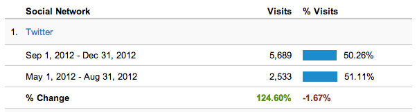 Значительно (на 124,6%) вырос реферальный трафик Twitter'а, что авторы исследования объясняют увеличением количества твитов, содержащих ссылки на посты и целевые страницы компании.