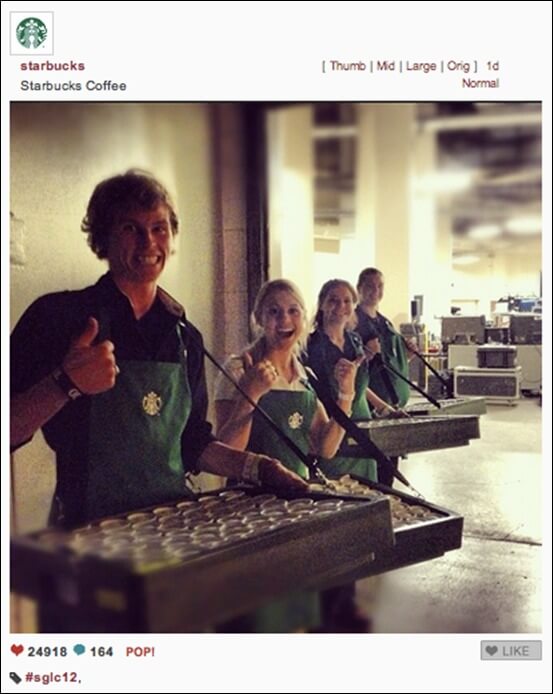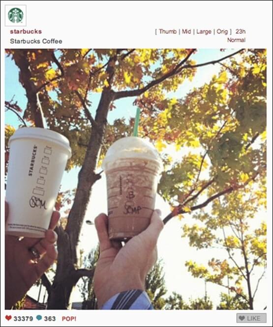 Starbucks использует Instagram для постинга фото о том, как его продукты влияют на образ жизни его клиентов. Бренд публикует сезонные картинки, фото из кофеен, изображения пользователей, пьющих кофе Starbucks в повседневной жизни. Все это добавляет человечности аккаунту бренда.
