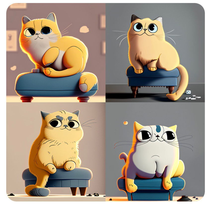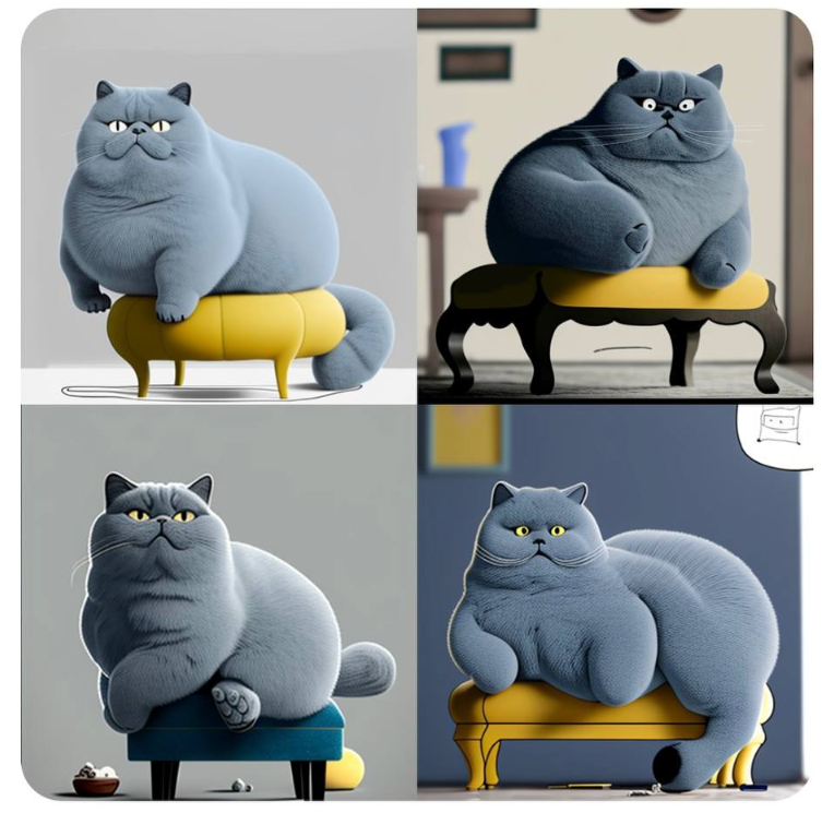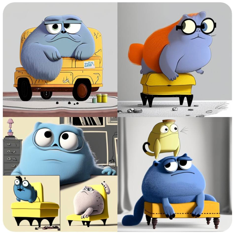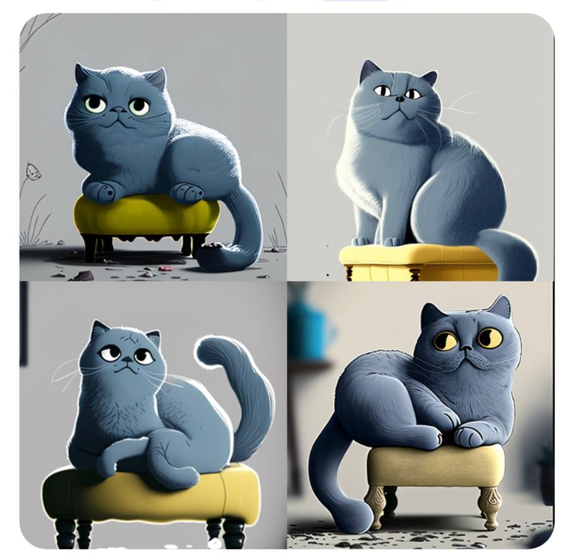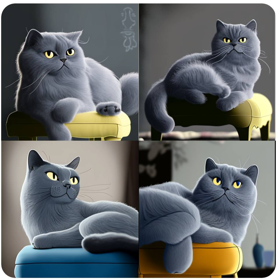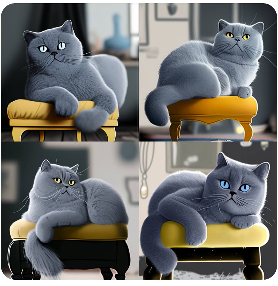 Первая попытка включала запрос Cute cartoon gray-blue cat on the ottoman (Милый мультяшный серо-голубой кот на пуфике) без исходника – было интересно, как нейросеть изобразит Пуфика без дополнительных подсказок. Вот что получилось.