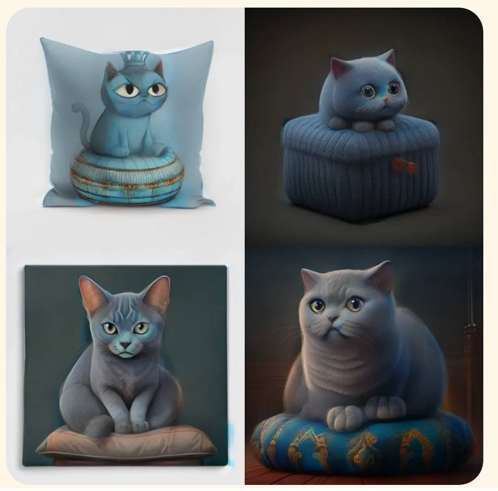 Получилось стильно и брутально, эти коты – настоящие хозяева жизни. Но создатели хотят больше милоты и меньше натурализма, поэтому запрос переформулировали: Gray-blue cute cat (серо-голубой милый кот).