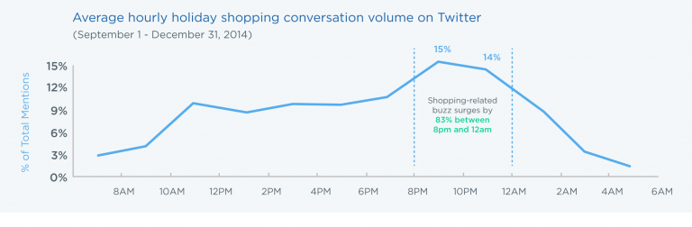 В конце каждого года Twitter фиксирует всплеск связанных с шопингом тем, который напрямую коррелирует с периодами распродаж. Например, согласно данным исследования NPD Group, во время рождественско-новогоднего сезона 2014 года пользователи Twitter начинали активнее обычного обсуждать ноутбуки или носимые устройства именно в момент горячих распродаж.