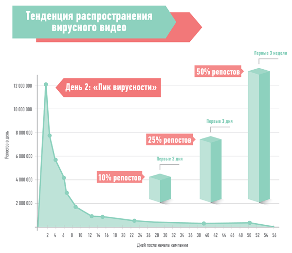 У компании есть порядка двух суток, чтобы вывести видео в топ. По статистике «пик вирусности» приходится на второй день после запуска кампании, дальше скорость распространения видео постепенно снижается. Как правило, за первые три недели видеоролик набирает 50% всех просмотров.